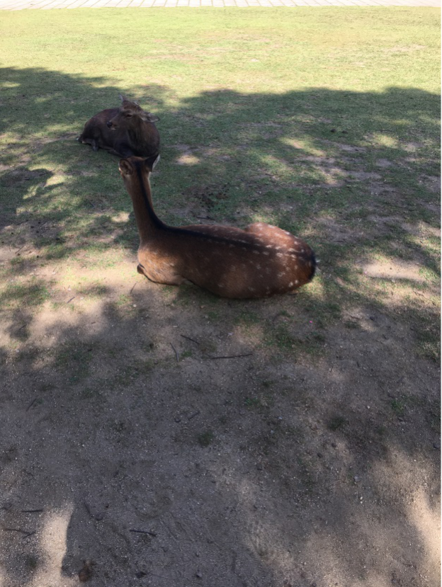 东大寺看梅花鹿,很多人买鹿饼喂,也不怕人,你投降才不会跟着你,否则会跟着上公交车也说不定。