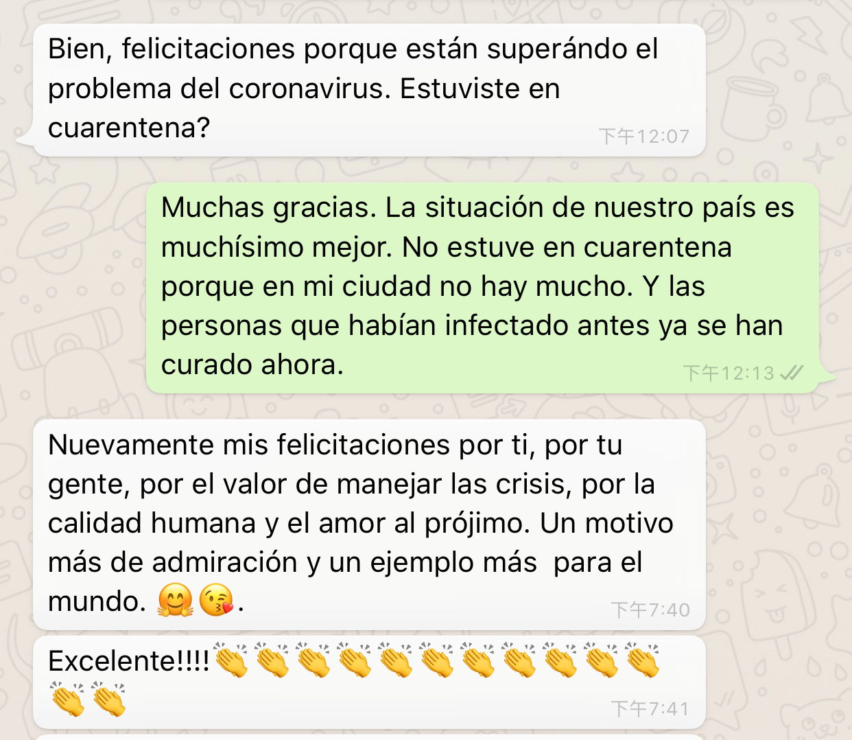 对于一个刚离开校门不久的职场小白来说,刚开单就碰到了一个非常善解人意,充满正能量的客户,真的是一件非常幸运的事情。下单之前他就对我表示了慰问,在聊业务的过程中也谈到最近的疫情,称赞我们人民不屈不挠和敢于奉献的精神,钦佩我们的政府统筹兼顾,最大限度保障了我们的权益和正常生活。称赞我们的国家excellent,是世界的榜样,在看到太多辱华和对中国攻击性的言论之后,看到这样的聊天记录真的让人很感动。(客户发了一大段称赞我们的话)